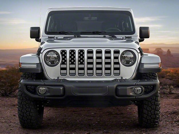 Stylish and Durable Grille Insert. The ZKD Customs Grille Insert features a striking black and light gray American flag design, adding a patriotic touch to your Jeep Gladiator JT. Laser cut from high quality ABS plastic, this grille insert combines aesthetic appeal with durability.