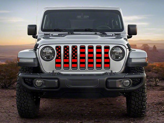 Bold Patriotic Statement. Express your American pride and personalize your Jeep Wrangler JL with this ZKD Customs Grille Insert. The striking design features a powerful black background contrasted by a vibrant red and black American flag. This isn't just a decal; it's a high-quality insert that seamlessly integrates with your Jeep's front fascia, giving your ride a unique and unmistakably patriotic look that will turn heads wherever you go. Whether you're cruising down Main Street or conquering a challenging off-road trail, show off your American spirit with this bold and eye-catching upgrade.