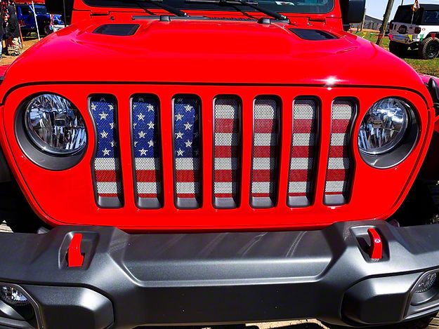 Patriotic Upgrade. The ZKD Customs Grille Insert offers a vibrant American Flag design with Candy Apple Sparkling Paint that contours the front of your grille, providing a fierce and customized look for your Jeep Wrangler JL. Moreover, his grille insert lets you personalize your vehicle's appearance without restricting airflow.