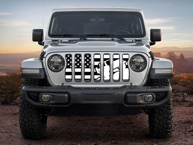 Application. This ZKD Customs Grille Insert; Offroad Vehicle Climbing Black and White American Flag fits all 2018-2023 Jeep Wrangler JL models.