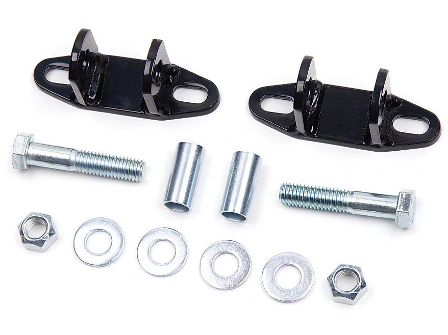 Eliminate Clunking. Tired of that clunking sound on your Wrangler TJ's upper rear shock mounts? Then consider Zone Offroad's Bar Pin Eliminator Kit. This pair of bar pin eliminator brackets converts the upper bar pin mount into a double sheer mounting bracket that correctly pre-loads the upper shock bushing to eliminate that annoying clunking once and for all.