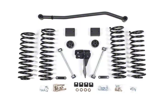 Full 4-Inch Lift. Made for the Jeep Wrangler JK 2-Door, this Zone Offroad Coil Spring Suspension Lift Kit comes in a matte black and glossy black finish. Centered on 4 full-length replacement coil springs, this kit gives your ride a front and rear lift of 4-inches. This kit includes coil springs, bump stop extensions, a track bar, sway bar links, track bar brackets, brake line extensions, and a track bar relocation bracket.