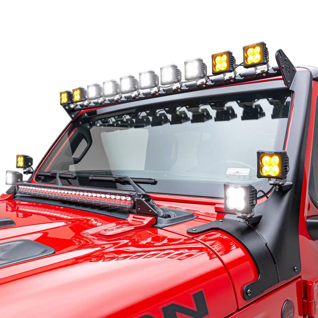Brilliant Front Lighting. Prep your Jeep Gladiator for nighttime outdoor adventures by adding this ZRoadz Multi-LED Roof Cross Bar and A-Pillar Light Mount with Fourteen 3-Inch LED Light Pods. This complete front-facing lighting kit’s got everything, from the lights to the mounting brackets. The light set features (10) white and (4) amber 3-Inch ZROADZ LED pod lights. Meanwhile, the mounting kit comes with the roof cross bar and A-pillar mounting.