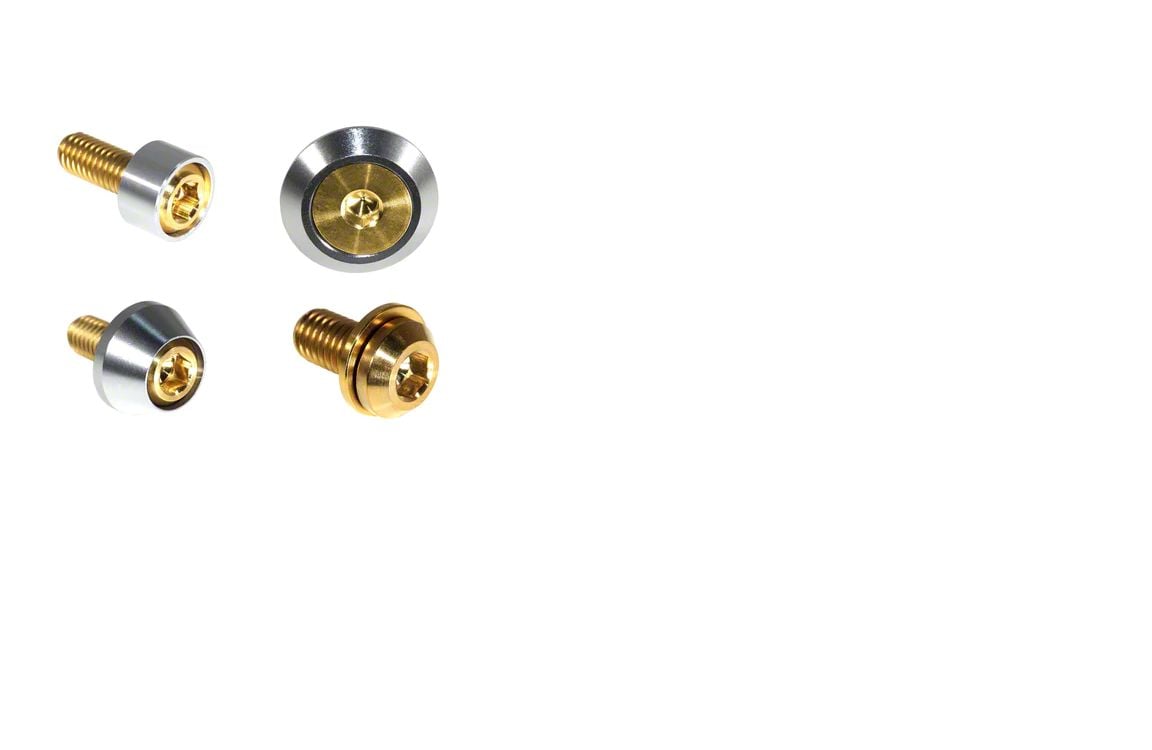 Construction and Specifications. Produced in a state-of-the-art facility with strict attention to detail, this fastener kit includes grade-5 titanium hardware and billet aluminum finish washers. The materials used ensure high durability and corrosion resistance. The Gold/Silver finish adds a modern and sophisticated touch to your vehicle's interior. This kit is built to meet or exceed industry-leading quality and safety standards, guaranteeing reliable and long-lasting performance.